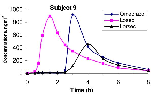 The enteric coating can change the drug’s concentration-time profile too. As the tablet only disintegrates in the small intestine instead of the stomach, this reflects as a lag time before we start detecting drug being absorbed into the blood. Depending on the type of formulation, the rate of release of omeprazole may also differ and impact the overall absorption rate of the drug. (see attached figure from Mostafavi SA et al. https://www.researchgate.net/publication/286716167_Relative_bioavailability_of_omeprazole_capsules_after_oral_dosing#fullTextFileContent) We can use either a transit or a lag compartment to model this delay in absorption. This allows us to capture the actual absorption process, while accounting for the effect of the enteric coating.